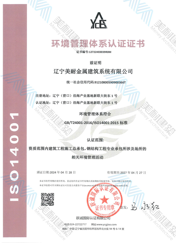 辽宁美耐金属建筑系统有限公司位于辽宁(营口)沿海产业基地,专注于预制金属建筑系统领域,是一家集工业建筑设计、制作、施工及相关的技术咨询与服务为一体的综合性服务企业。作为国家钢结构协会会员、中国建筑金属结构协会会员单位与国家高新技术企业,美耐建筑集建筑工程施工总承包、钢结构工程专业承包等多种资质于一身,并拥有22项钢结构建筑领域专利,9项软件著作权。